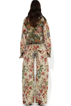 Boyfriend trousers crafted from a beige floral brocade. With a relaxed waist, five functional pockets and a wide-leg design.