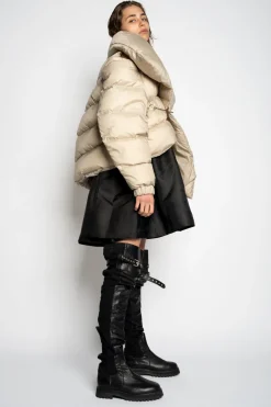 This M'A puffer jacket in a beige features a pointed open-collar silhouette, a striking silver safety pin closure, the asymmetric hem and opening on the left shoulder, make this a unusual kind of jacket.