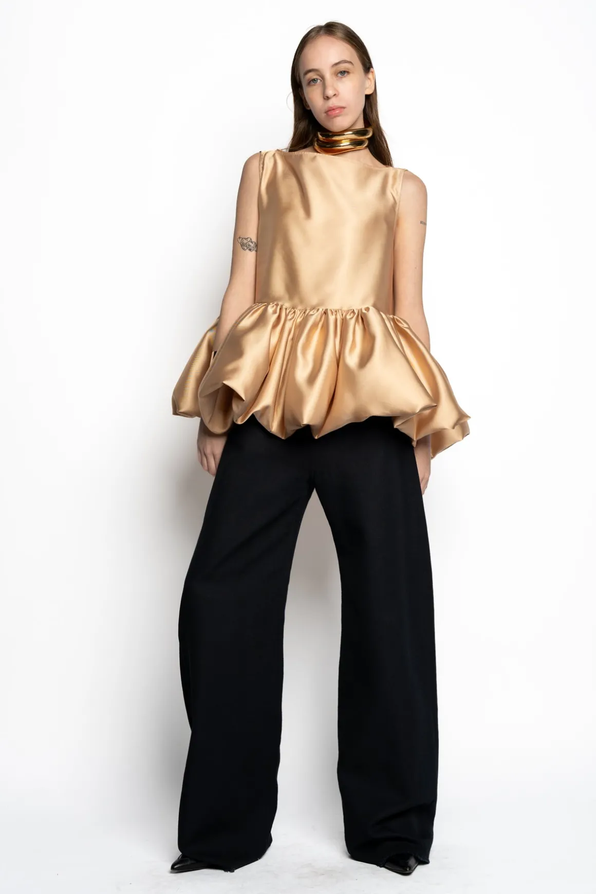 Upgrade your wardrobe with this beige sleeveless puff hem top in mikado. Complete with a round neck, it's the perfect addition to any trendy outfit.