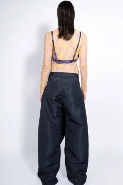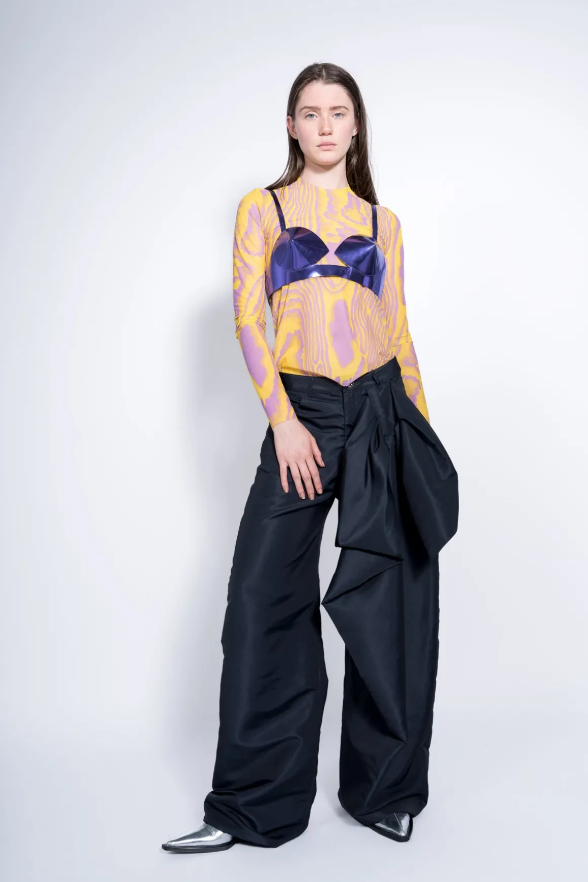 Step out in style in these black taffeta boyfriend trousers with a big bow and silver buttoning. Pockets offer added practicality, so you can look and feel your best.