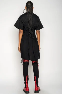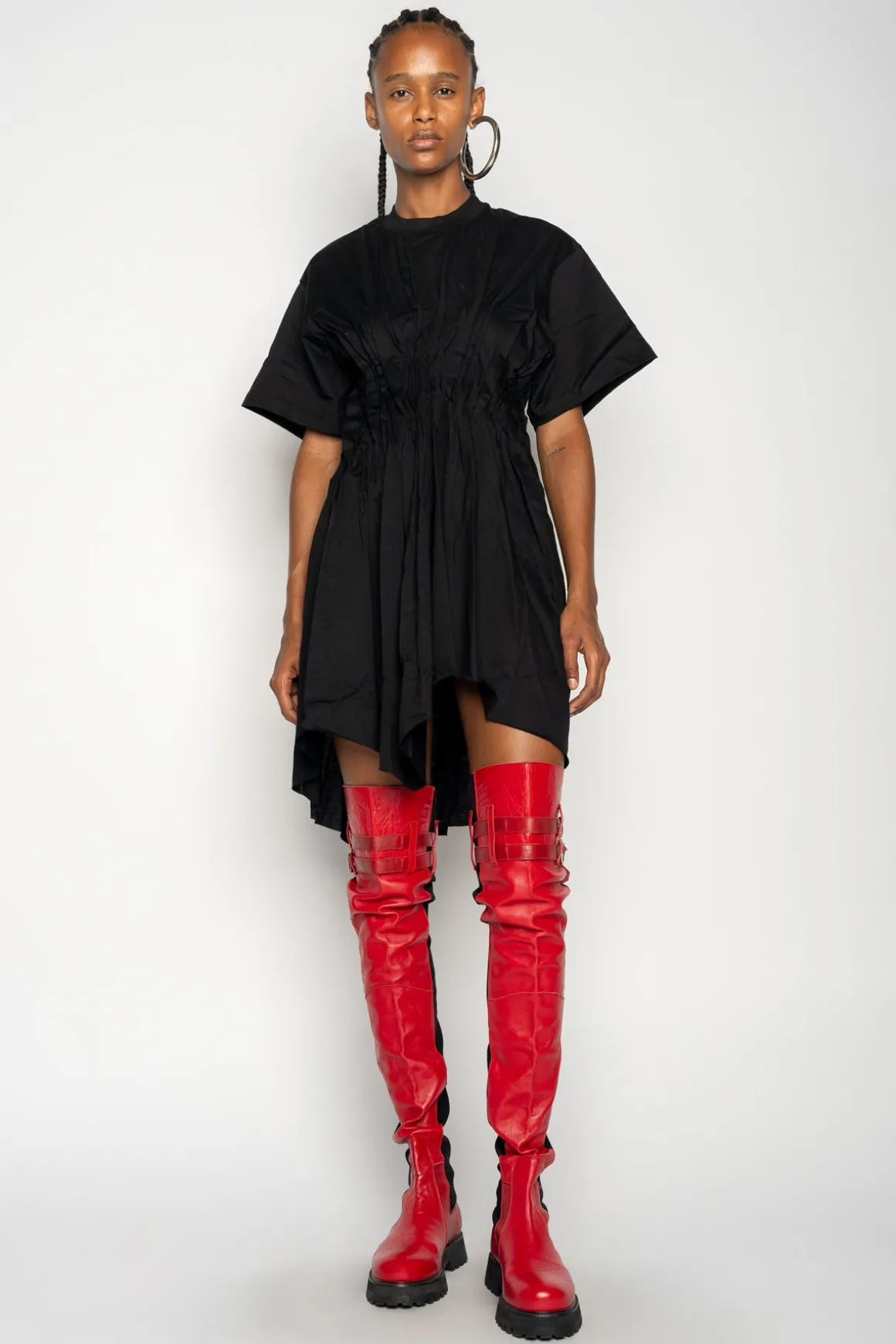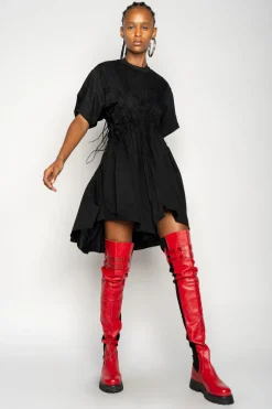 Crafted from organic cotton, this black t-shirt dress boasts a cinched pleated waist to flatter the figure and an asymmetric hem for an on-trend look.