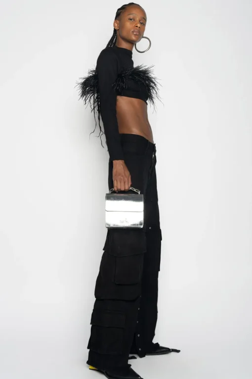 Slip into our black cropped top crafted from rib jersey, featuring a high neckline, long sleeves and delicate feathers adorning the hem!
