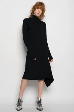 This black midi-dress crafted in merino wool boasts unfinished edges around its draped neckline, cuffs and asymmetric hemline.