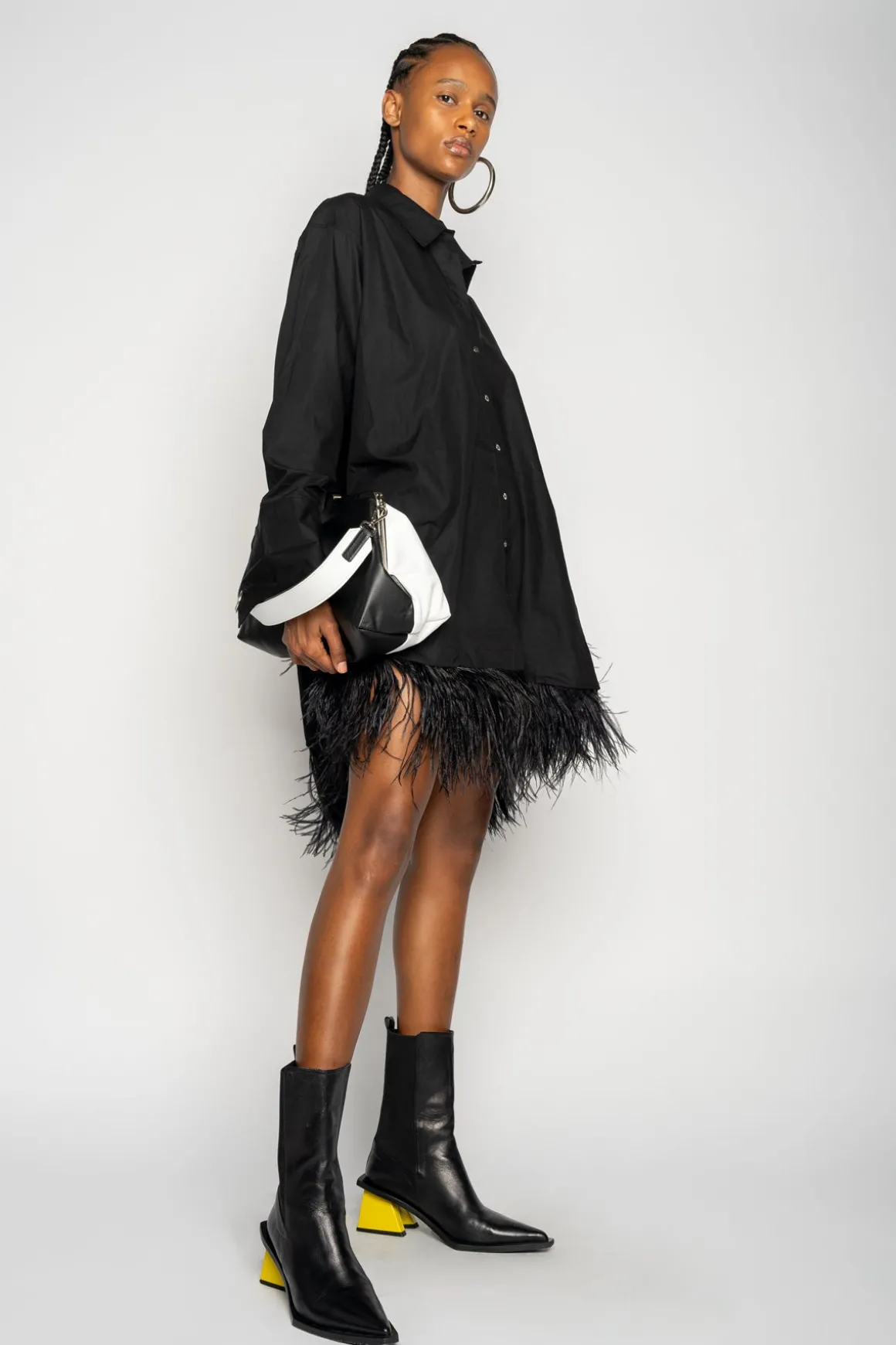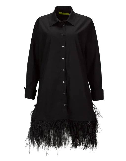 This oversized black organic cotton shirt dress features extra-long sleeves with a metal ring detail and a striking black ostrich feather hem.