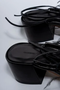 These black strappy sandals are crafted with medium square jump heels and adorned with black feather detailing!