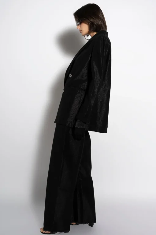 Upgrade your wardrobe with our sleek black lurex oversized blazer. It has front shiny metallic buttons, a v-neckline and two handy pockets.
