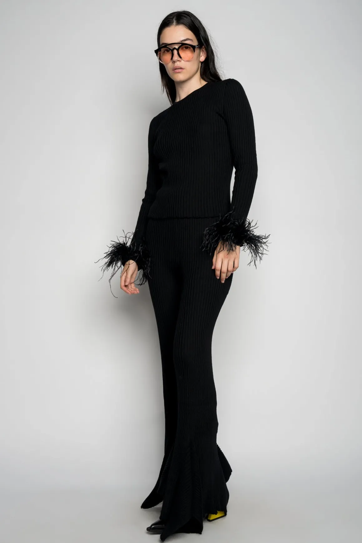 These black trousers feature deconstructed flared legs constructed from luxurious merino wool. Elasticated at the waist, they’re secured with an adjustable drawstring fastening.