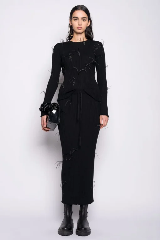 Long skirt crafted from merino wool, boasting feather pulls, an elastic waistband, and an adjustable drawstring waist for an upgraded look.