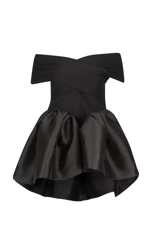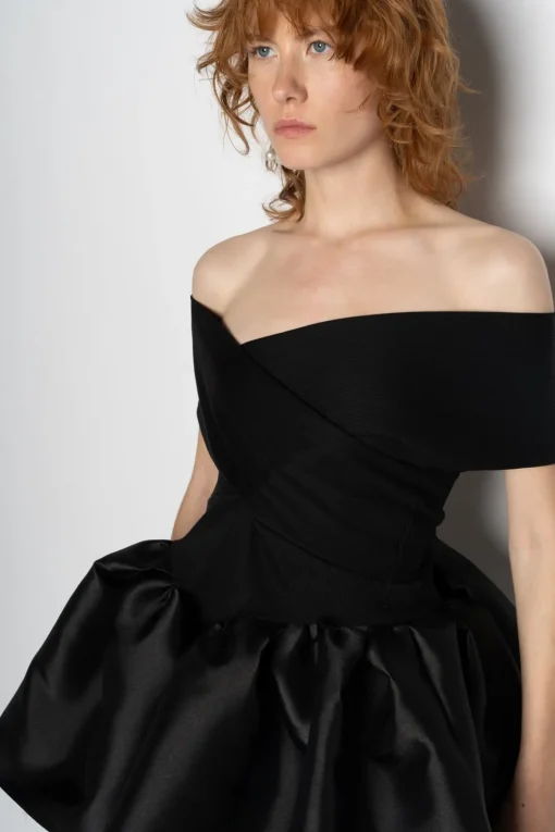 This top features a sultry off-shoulder design in a sleek black rib jersey, perfectly complemented by a puff hem in black mikado fabric.