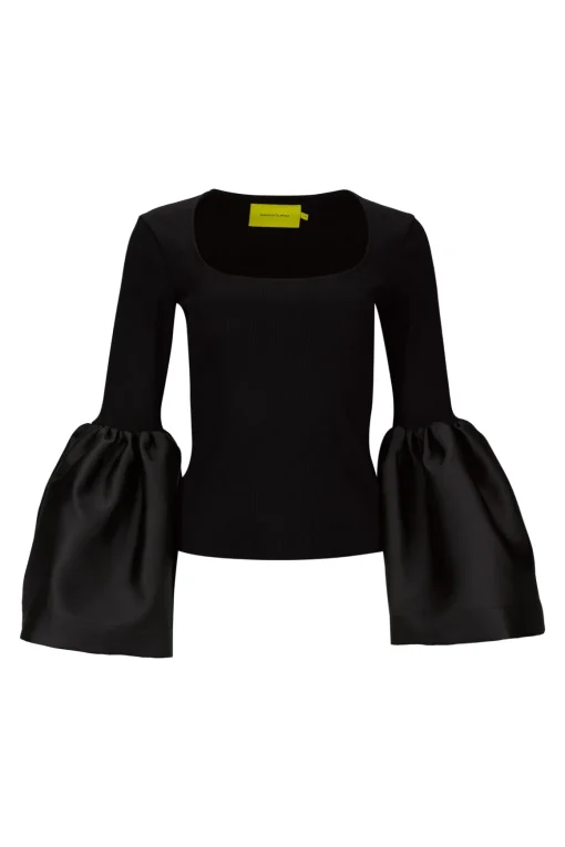 Rib-knit jersey top in black, designed with a scooped neckline and long sleeves, finished with voluminous taffeta puff cuffs!