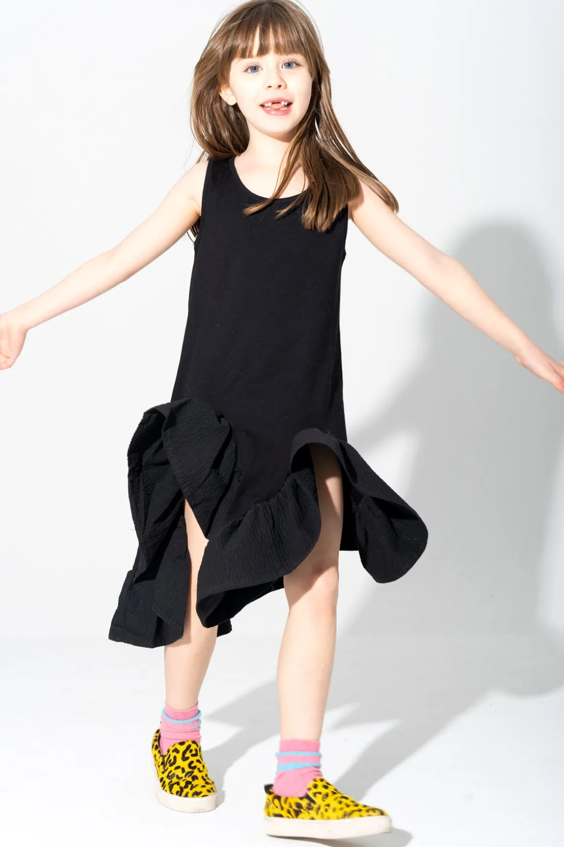 Go for a spin in this black jersey sleeveless dress with flouncy frills 'n a round neckline, perfect for kiddos looking to rock a midi-length fit.
