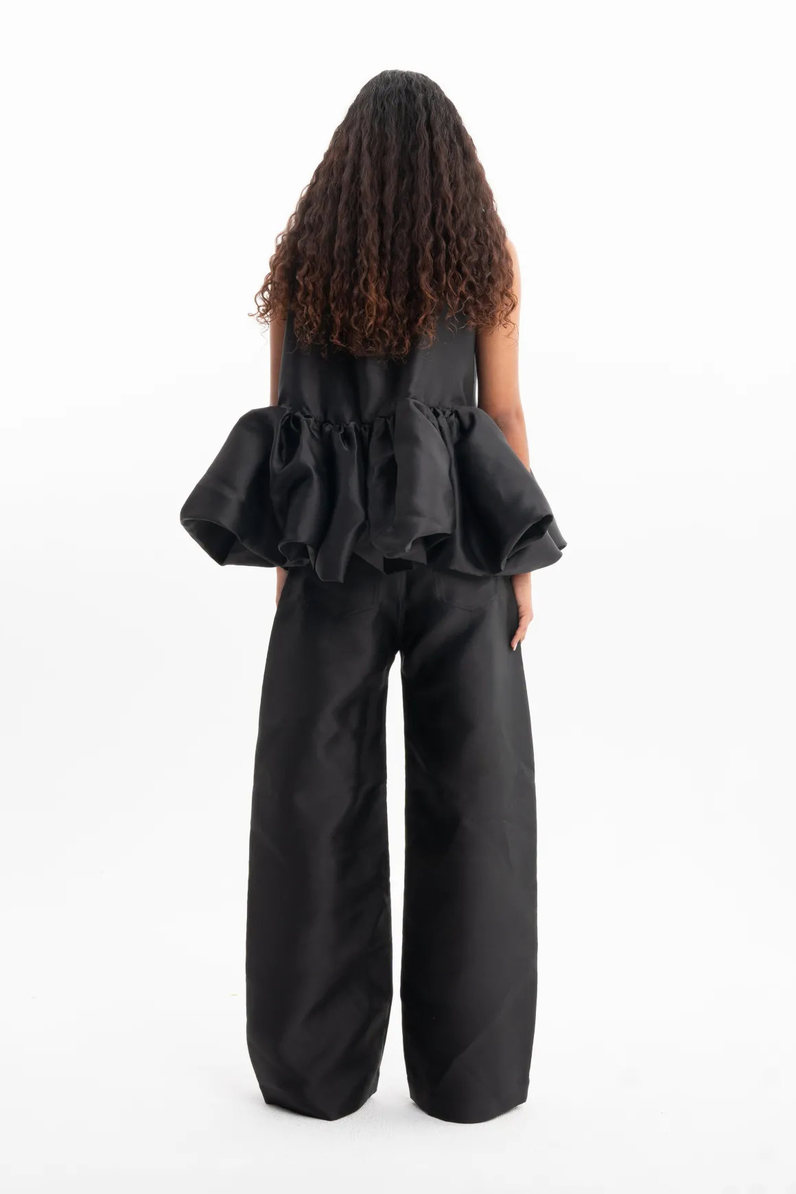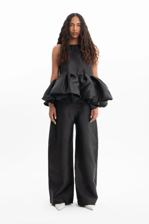 Enhance your wardrobe with this stylish black sleeveless puff hem top in mikado. Featuring a round neck, it's a must-have for any fashionable ensemble.