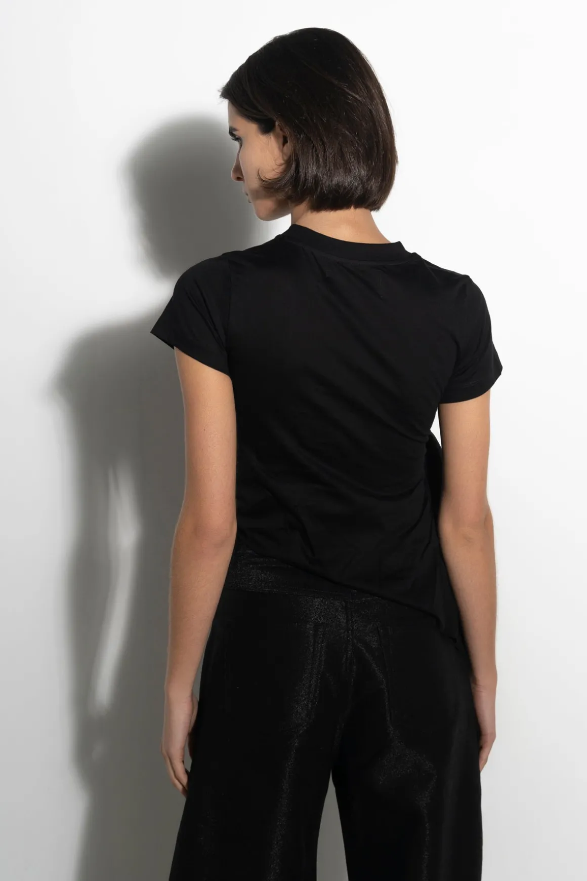 This black organic cotton t-shirt is sure to make a statement, with a bold bow detail along the side, round ribbed neckline and short sleeves.