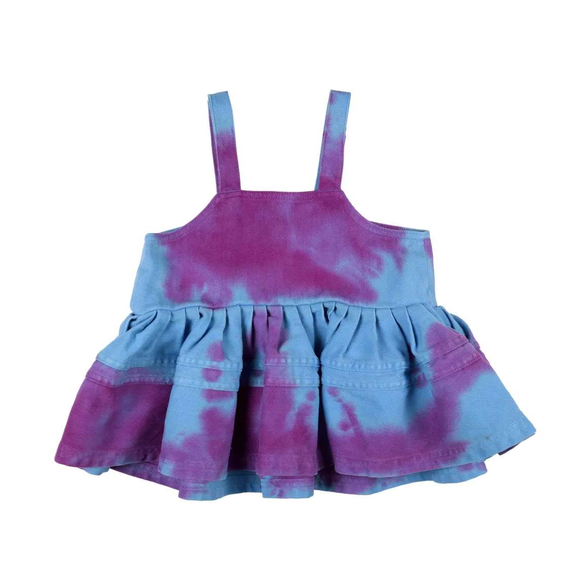 Blue and purple tie-dye sleeveless top. This top features a vibrant tie-dye design with a bold frill, making it perfect for kids who want to stand out while still feeling relaxed and free.