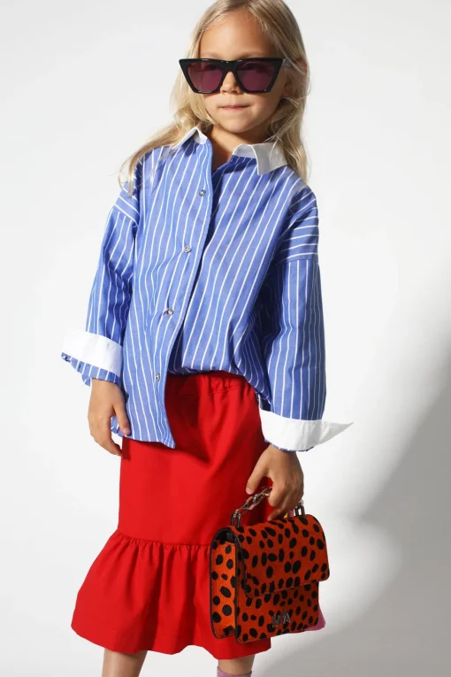This comfy kid-sized shirt has blue and white stripes, long sleeves, a white point collar, and fold-up white cuffs. No need to be a grown-up when you're styling in this sweet top!