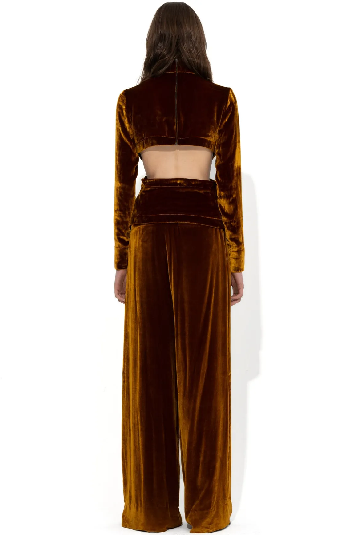 Velvet top with a turtleneck, front keyhole, open back with a zipper, long sleeves, and a form-flattering fit!