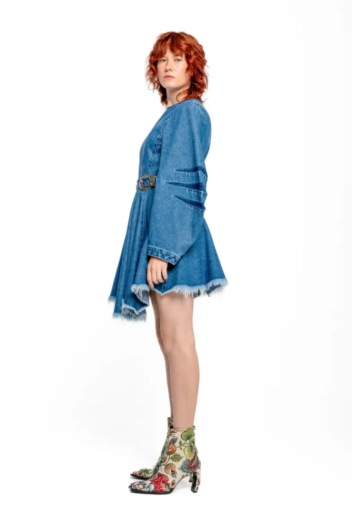 This denim short dress is the perfect addition to your wardrobe! The round sleeves, raw asymmetric hem, fitted waist with belt, and back zipper give it a stylish and comfortable look that will make you stand out from the crowd. Don't miss out on this must-have piece!