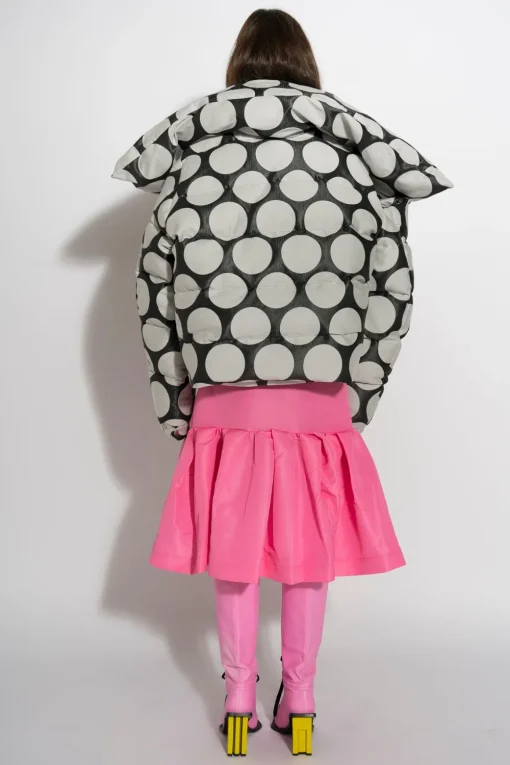 Classic M'A asymmetric duvet puffa jacket! Made of a black and white dot brocade, this jacket features a pointed open collar and silver safety pin closure. For a unique touch, it boasts an asymmetric hem and shoulder opening on the left side.