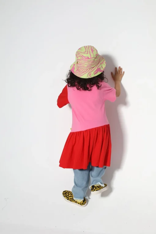 This red and pink t-shirt dress is crafted with gathered organic jersey cotton in pink with purple foil – perfect for your little one!