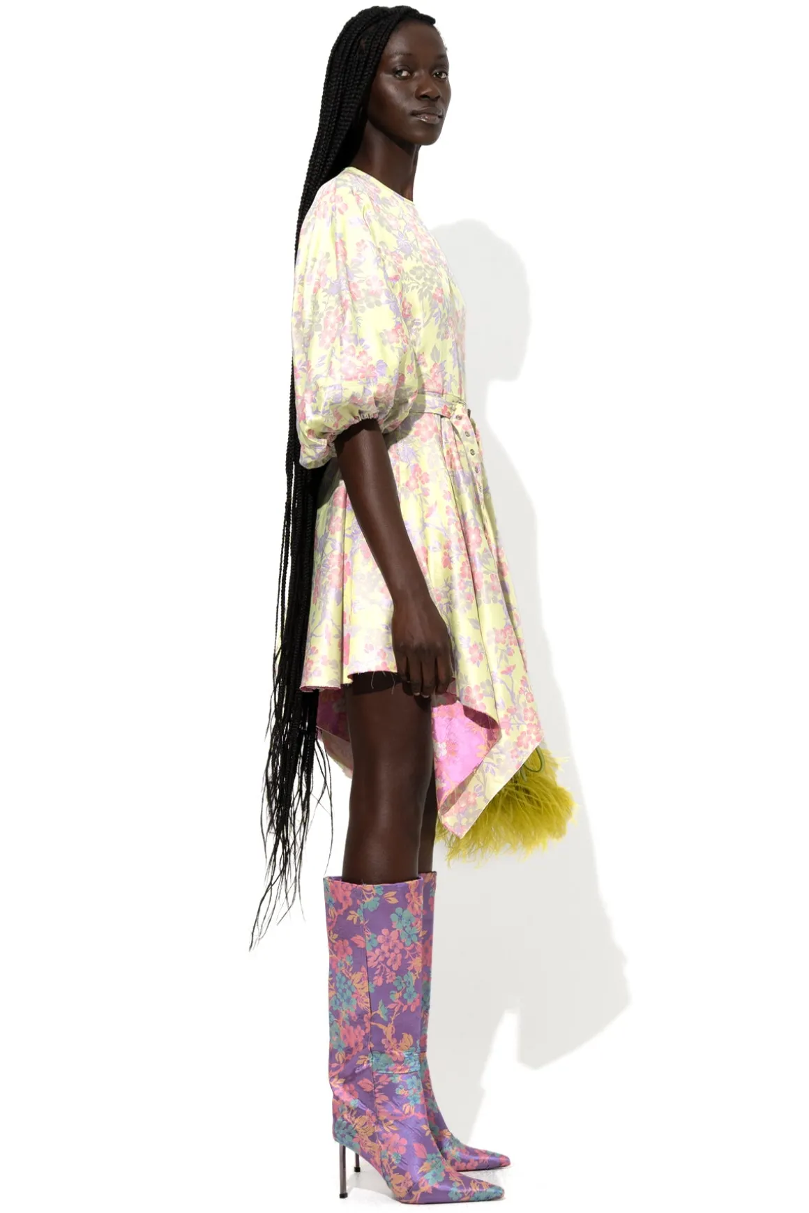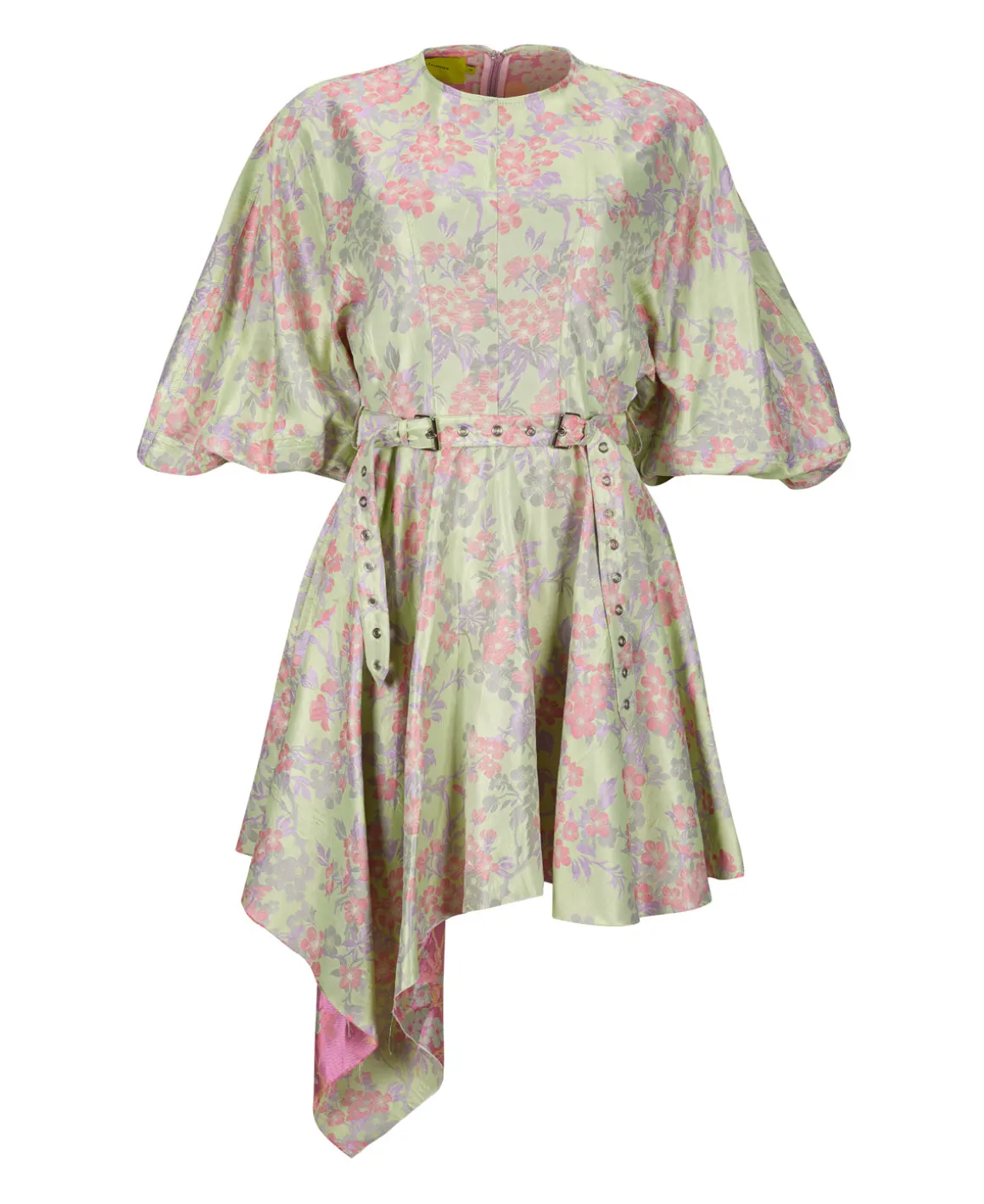 Vibrant green flowery brocade creates a round-sleeved dress with an asymmetrical, fringed hem. With 3/4 length, balloon sleeves and an adjustable waist belt, the hidden zip at the back ensures it fits perfectly!