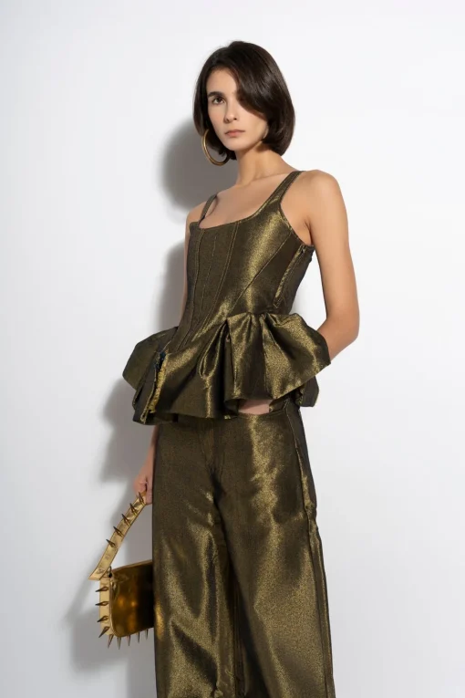 Gleam in this gold lurex denim corset! With its elasticated back, size zip and front peplum open hem, you'll feel cool and feminine.