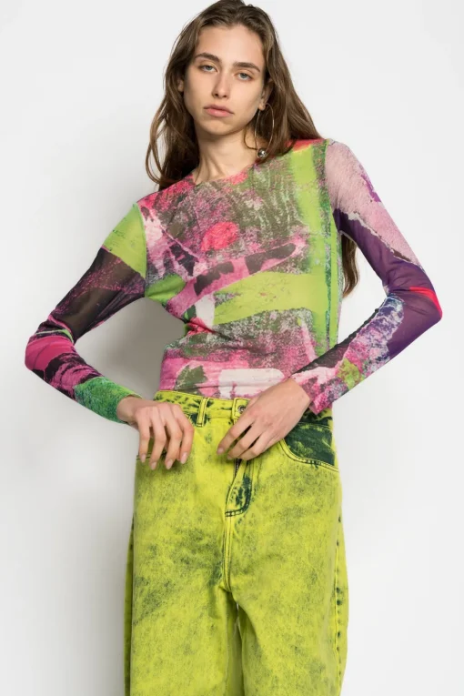 Mesh top in a colourful see-through graffiti print with a round neck and long sleeves, perfect for layering.