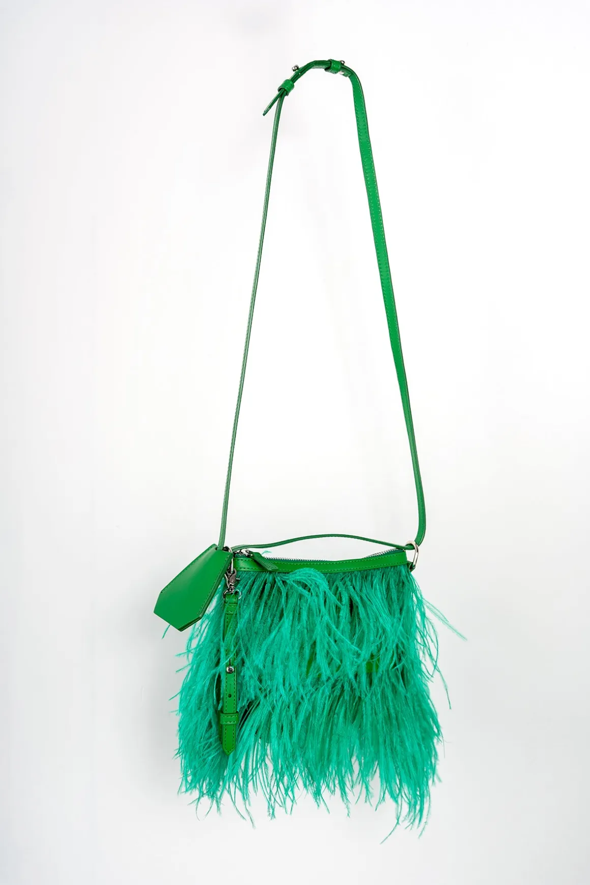 A stylish leather bag, adorned with soft, delicate green feathers. Boasting a secure zip closure and one inner pocket, this bag can be worn as a crossbody, a handbag or around the wrist as a clutch.