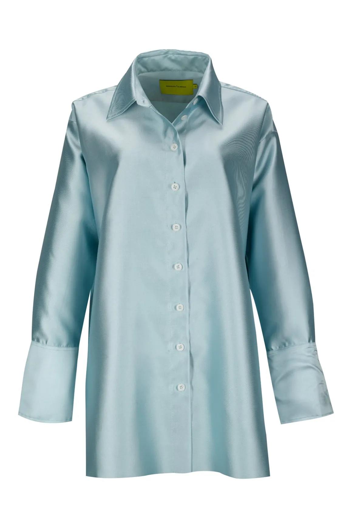 Meet our light blue mikado overshirt! Featuring long sleeves, a button-up front, a raw hem, and an oversized fit, you'll love the effortless allure this piece brings to your wardrobe.