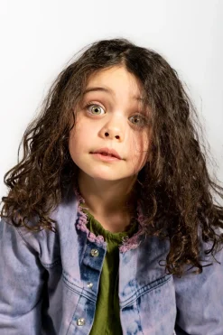 Loose and collarless, this denim jacket in lilac brings the fun raw frayed hem and fitted sleeves with structured cuffs – it's like a kid in a candy store.