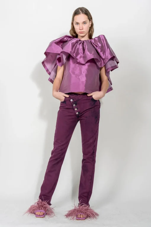 Meet our lilac cape top featuring a voluminous, pleated design and a gathered neckline. Fasten it in the back with a self-tie closure and make a statement!