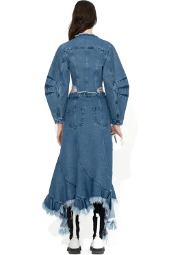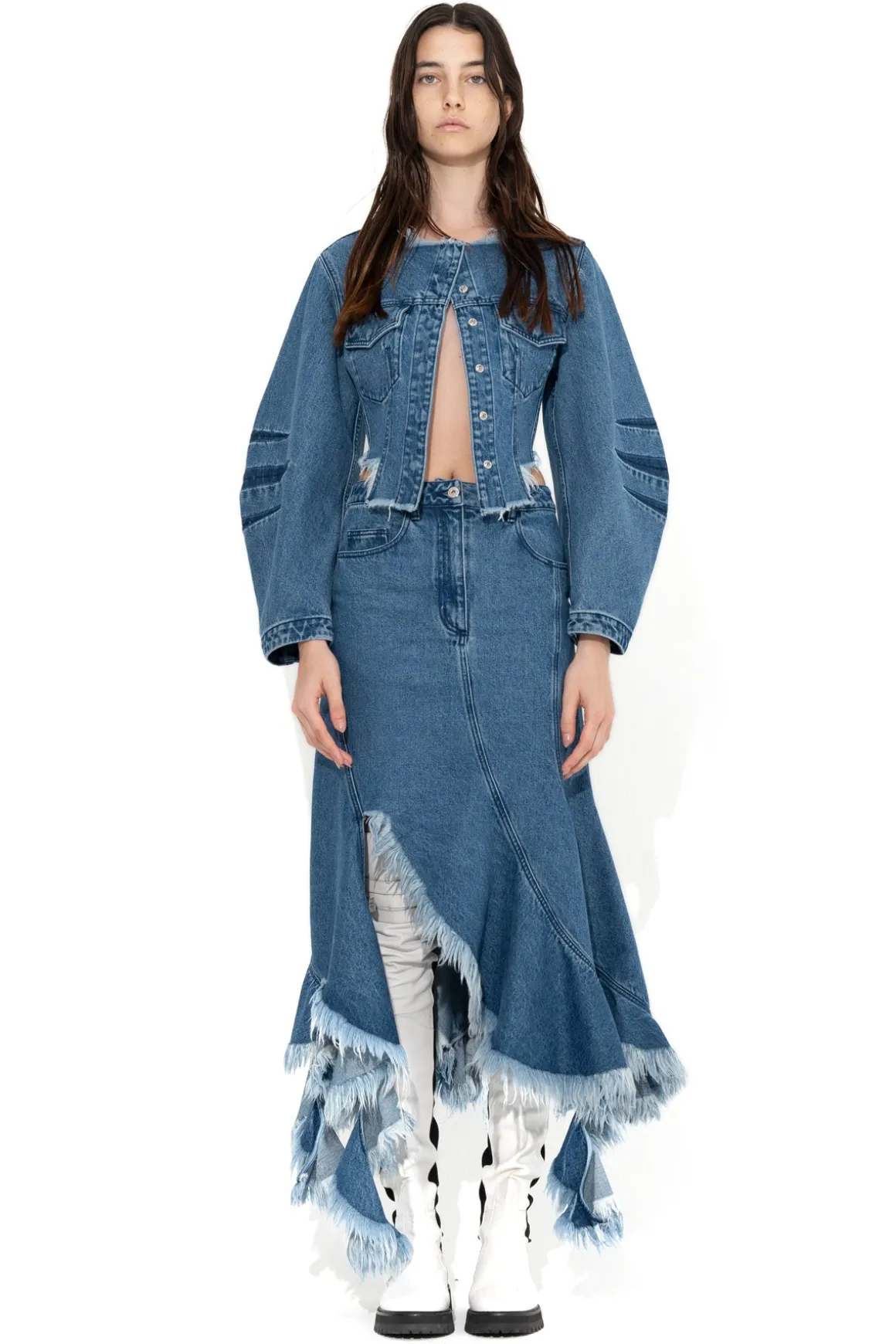 This mid-blue denim jacket captivates with its cropped fit, round shape sleeves, front snap buttons, raw hem and round neckline.