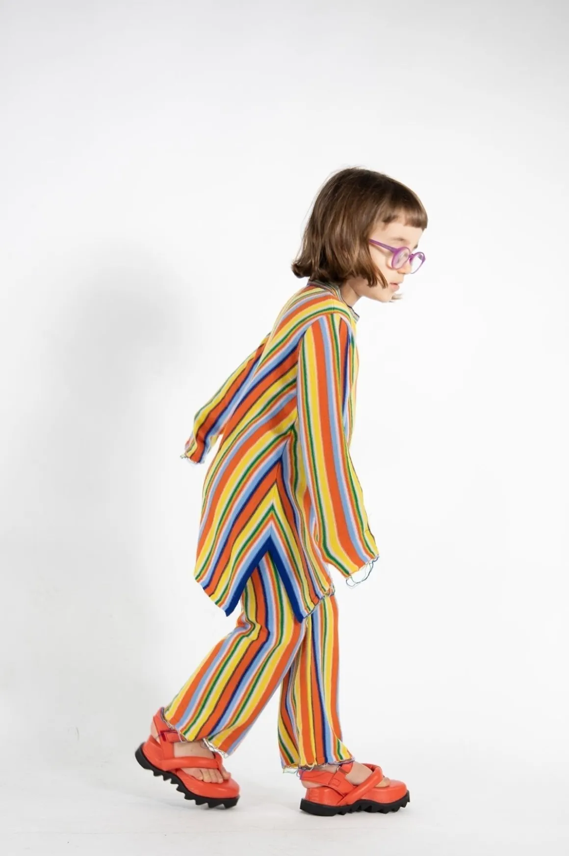 Multi-hued merino wool trousers boasting an elasticized waist, a high-waisted style, a raw-edged hem and a stripe pattern.