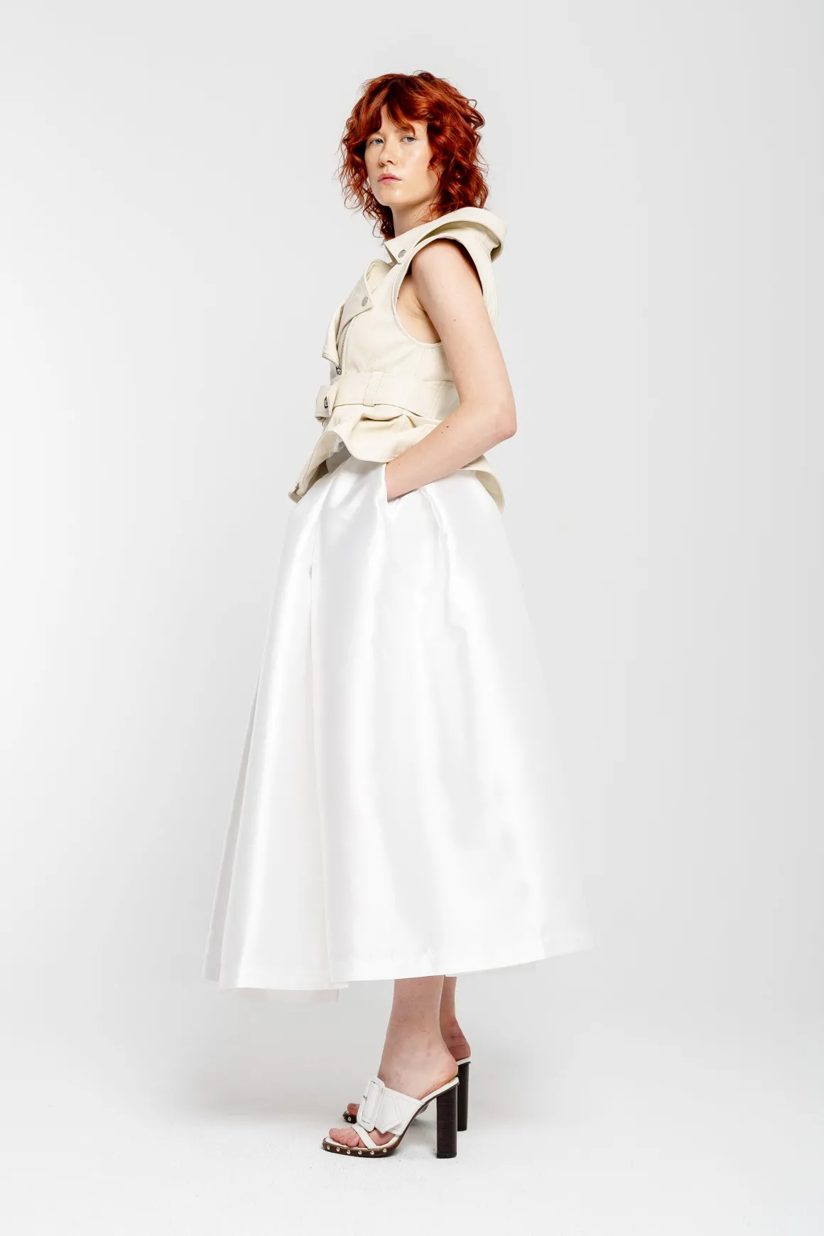Introducing the perfect statement piece for any fashion-forward bride-to-be: the Off-white Cinched Open Neck Leather Biker Vest! With its off-white color, pointy neck, unique peplum hem and belt closure, this vest is a must-have for your bridal collection. Make a bold statement with this edgy vest.