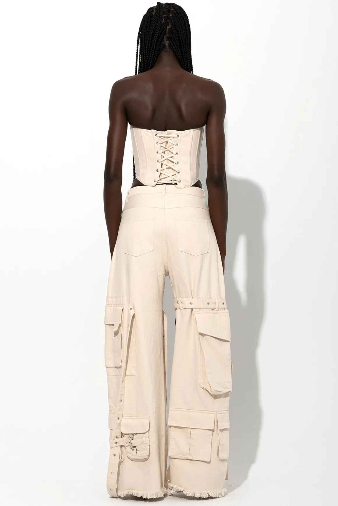 Transform your look with our off-white drill corset that boasts a unique angular neckline. The back lace-up feature adds a touch of glamour while enhancing your figure.