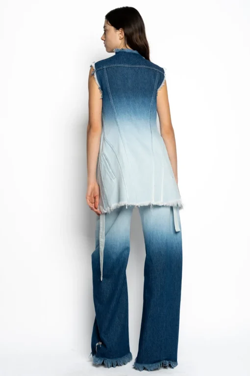 Make a statement with this ombre denim blue pushed-back vest that boasts frayed edges, front pockets, and asymmetric buttons for an edgy open design.