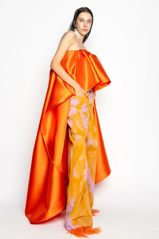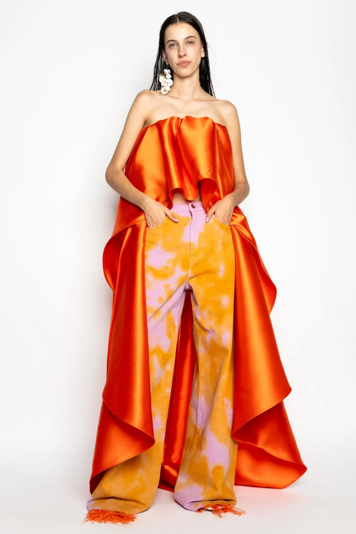 Get a bold look with these M'A 5-pocket boyfriend trousers in cool orange and pink tie-dye drill. These fashionable wide-leg trousers feature a comfortable high waist and raw hem.