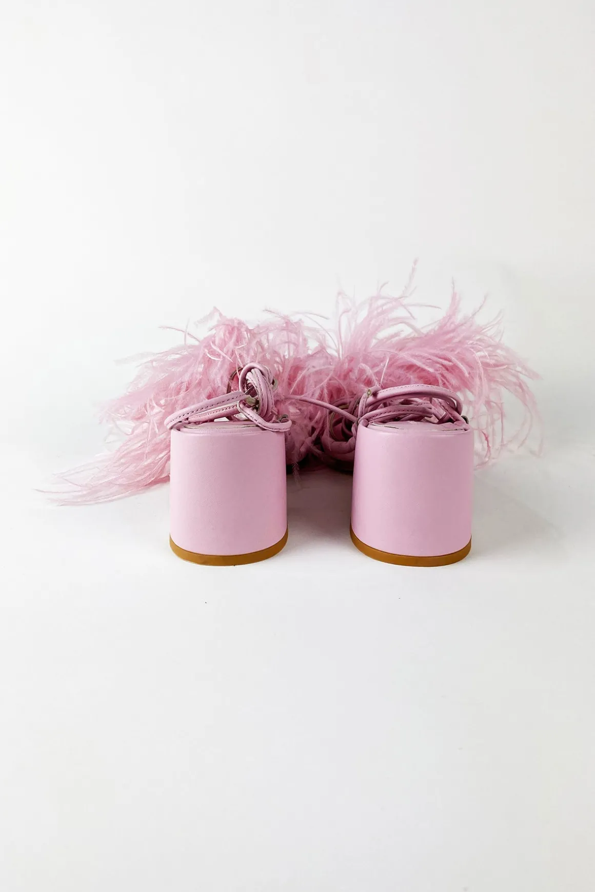 These stylish pink sandals feature a medium square jump heel and gorgeous pink feather detailing, perfect for making a statement.