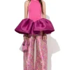 Make a statement in this bright pink rib jersey tank top with vibrant contrasting taffeta peplum that is sleeveless and has a puff hem.