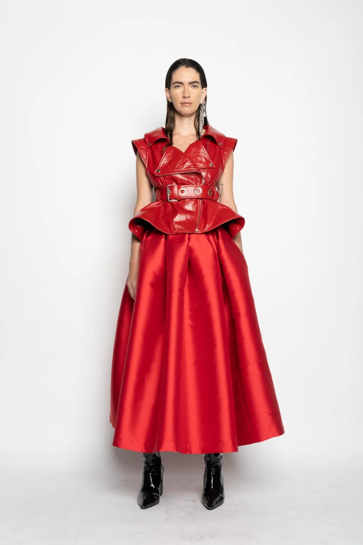 This red leather biker vest featuring an open pointy neck, peplum hem and belt, this vest is perfect for anyone who wants to make a statement.