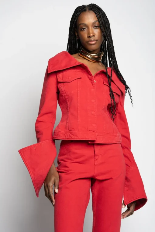 Our red off-shoulder jacket is crafted from high-quality red drill fabric and features two chest pockets, a pointy collar and cuff rings, making it a perfect addition to your collection.