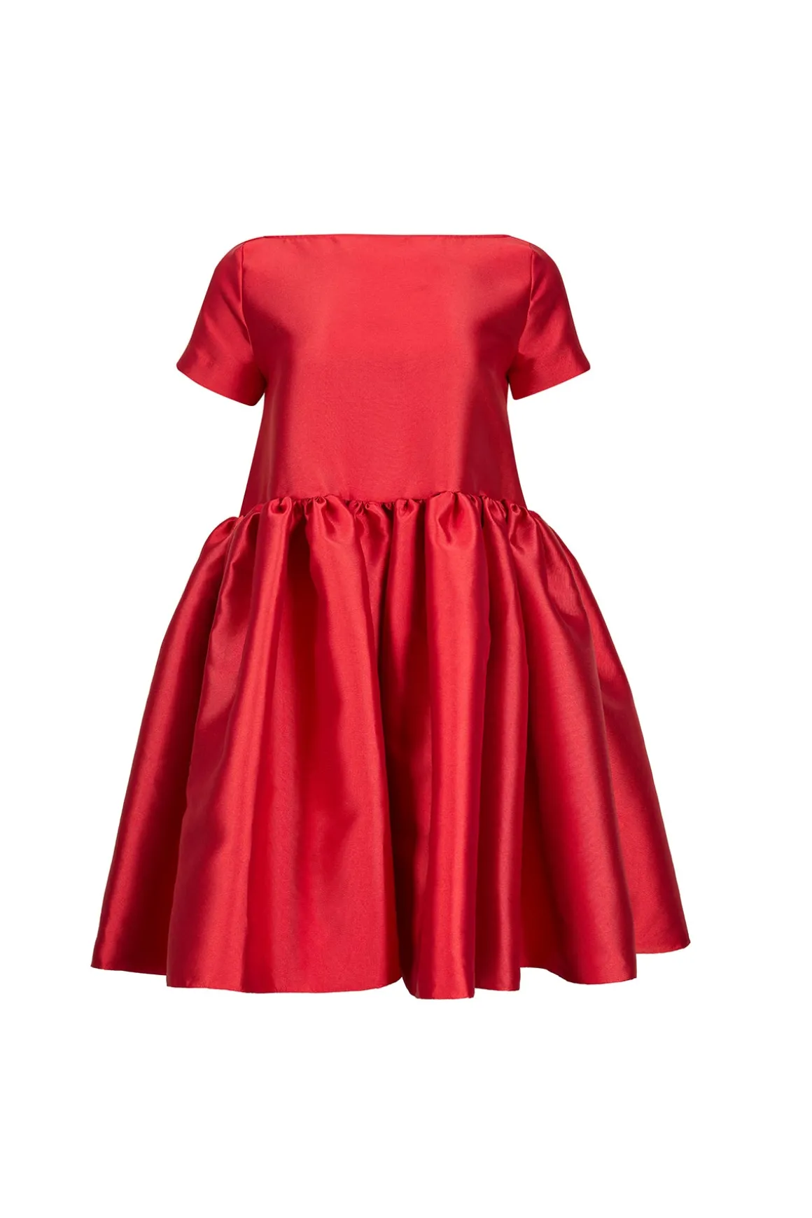 Impress in this red short cap sleeve puff dress made of mikado fabric. The boat neck adds a touch of elegance, while the puff hem adds a playful twist. This dress will have you feeling confident and chic.