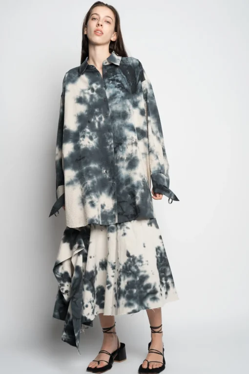 XXL textured cotton button-up shirt that promises comfort and style. Boasting a black and off-white tie dye, a pointy neck collar, fold-up cuffs and an asymmetrical hem.