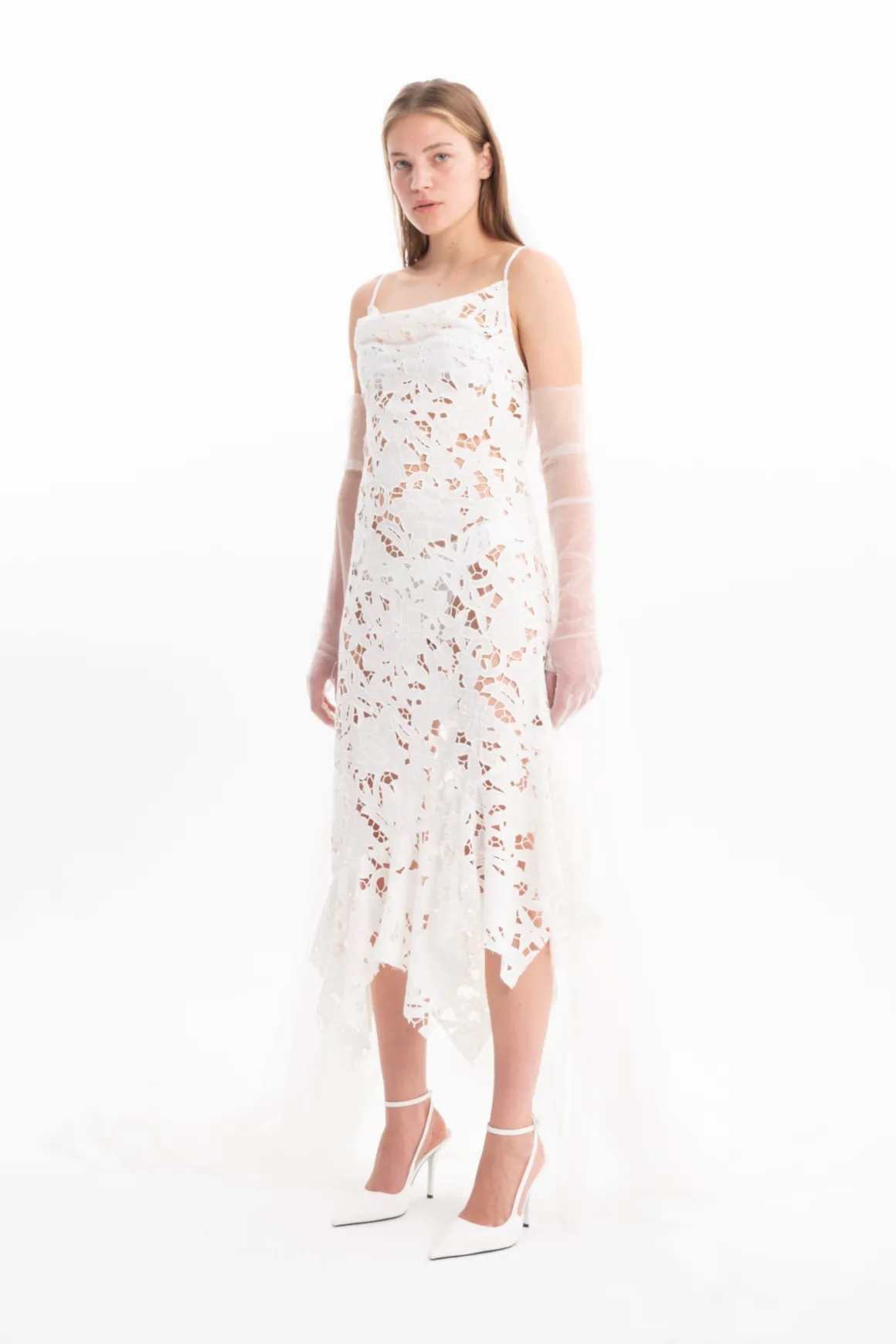 This white embroidered cotton midi dress with spaghetti straps is a total showstopper! Delight in its square cowl neckline, asymmetric hem and peplum detail.