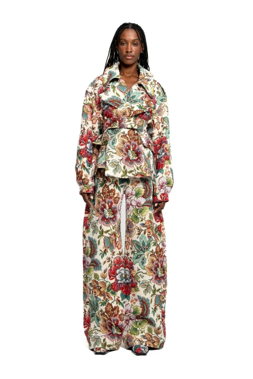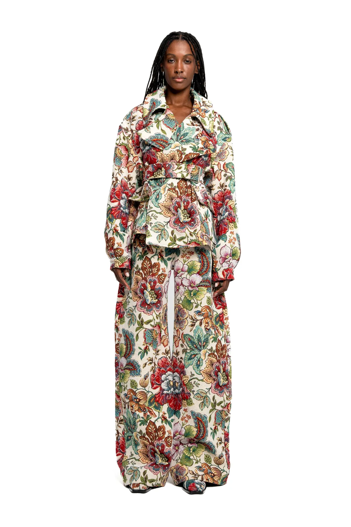 Discover the opulent blend of White Floral Brocade Boyfriend Trousers. With a classic 5 pocket layout, a relaxed fit and unfinished hems, these trousers radiate effortless elegance and charm.