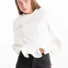 Experience the ultimate comfort and style with our white frill hem sweatshirt. Its balloon sleeves add a touch of playfulness, while the ribbed neck and cuffs provide a perfect fit.