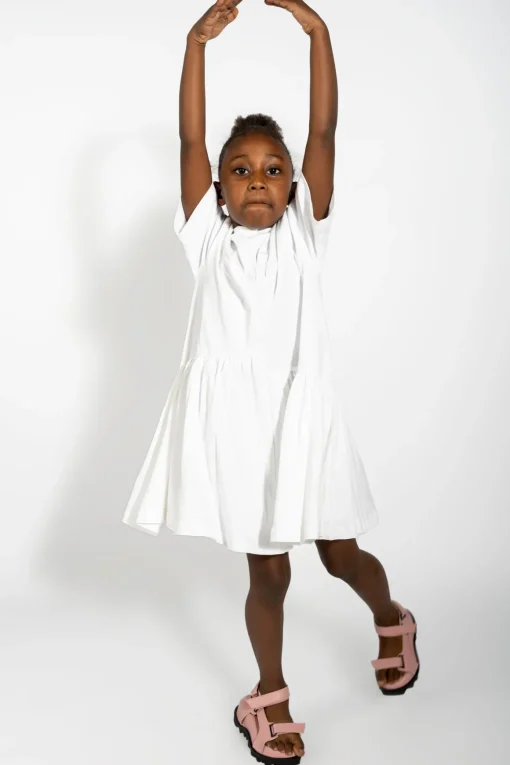 Let your kiddo lookin' fly in this white gathered jersey t-shirt dress crafted from organic cotton that is gathered, has short sleeves and a crew neck.
