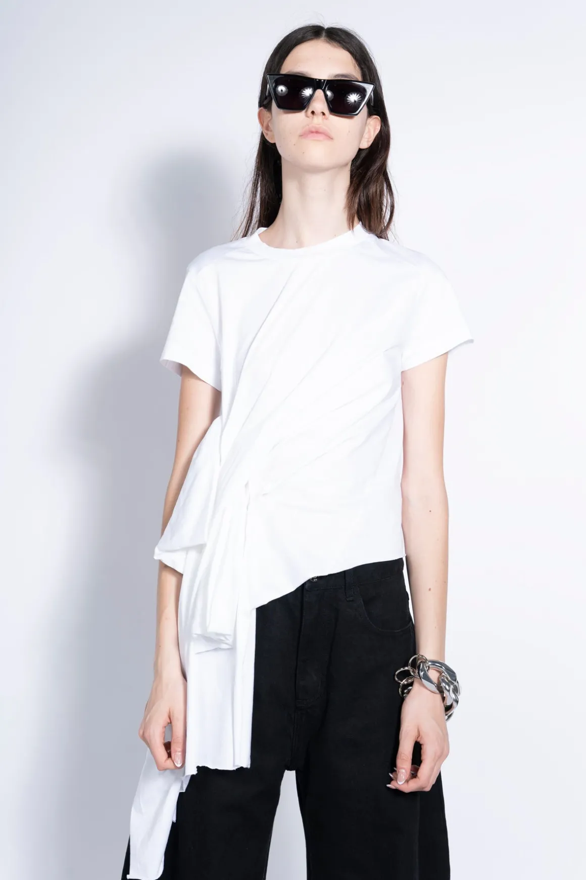 A soft organic white cotton t-shirt that has a round neckline and a draped style for a flattering figure. The look is complete with a side bow – the perfect addition to any wardrobe!