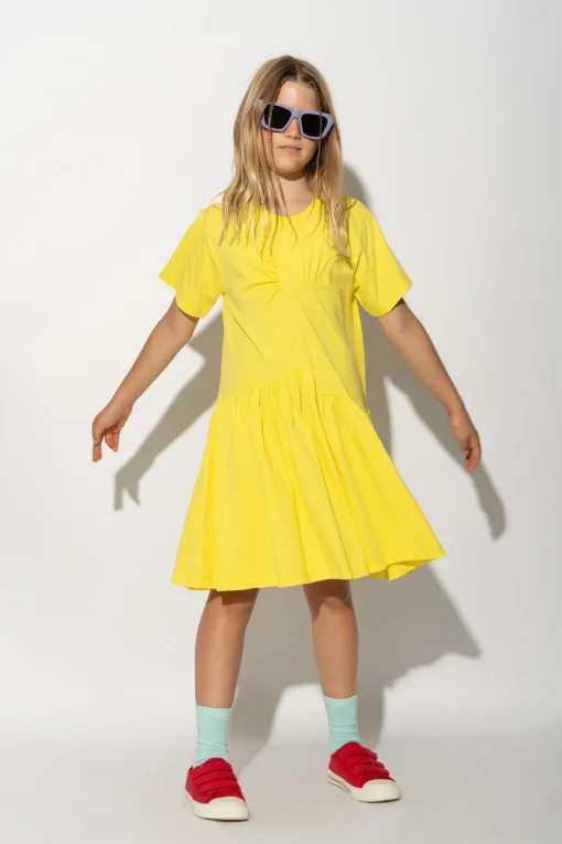 Made of soft, comfortable jersey material in a bright shade of yellow, this dress features short sleeves and a round neck. The unique gathering in the front adds a playful touch to any young fashionista's wardrobe!
