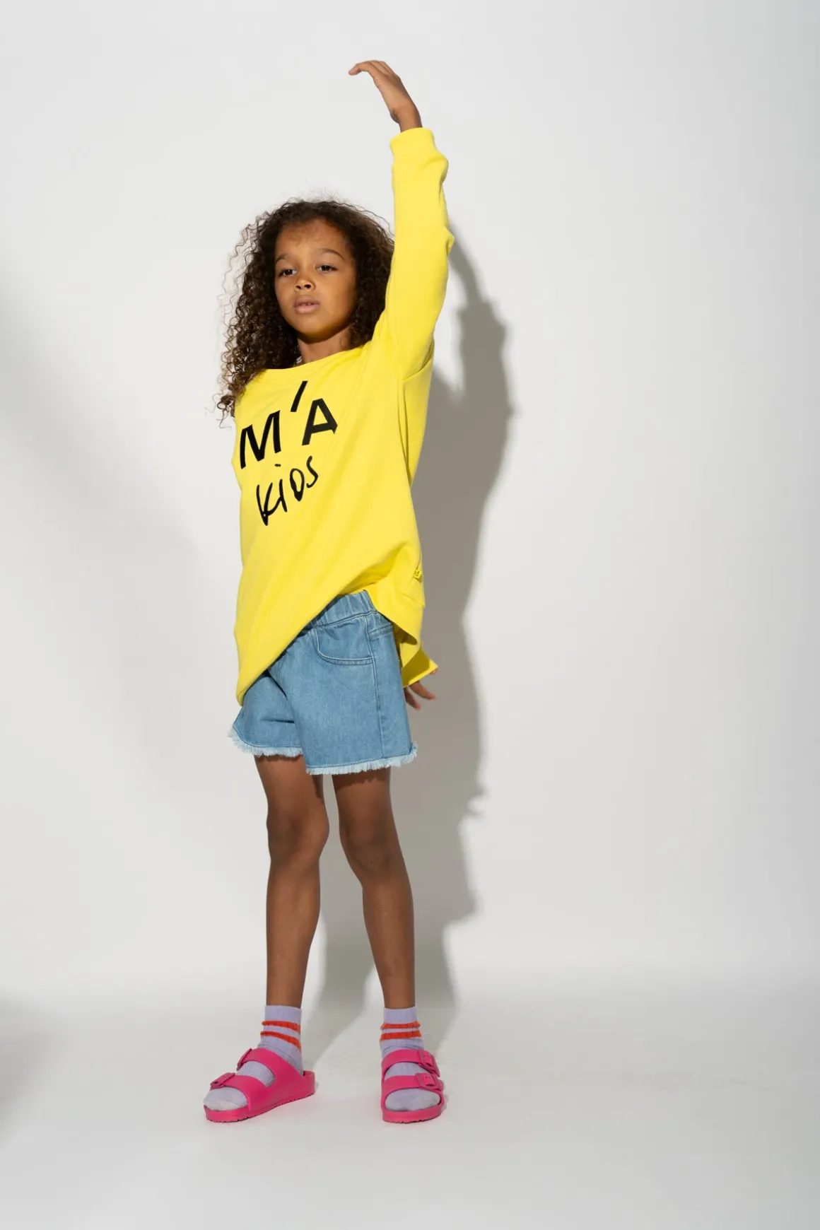 Our yellow sweatshirt is perfect for your little one! With a soft fleece material, long sleeves and a classic round neckline, they'll never want to take it off. Plus, the fun black M'A Kids logo on the front adds a touch of style and personality.
