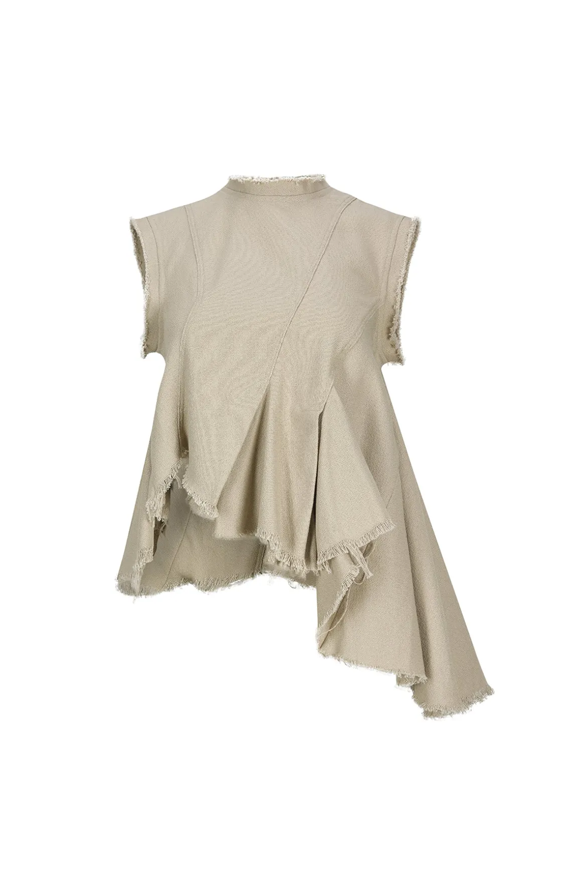 This beige sleeveless top in woven with frayed edges, a unique asymmetric flounce hem and back zip fastening make this piece a must-have.